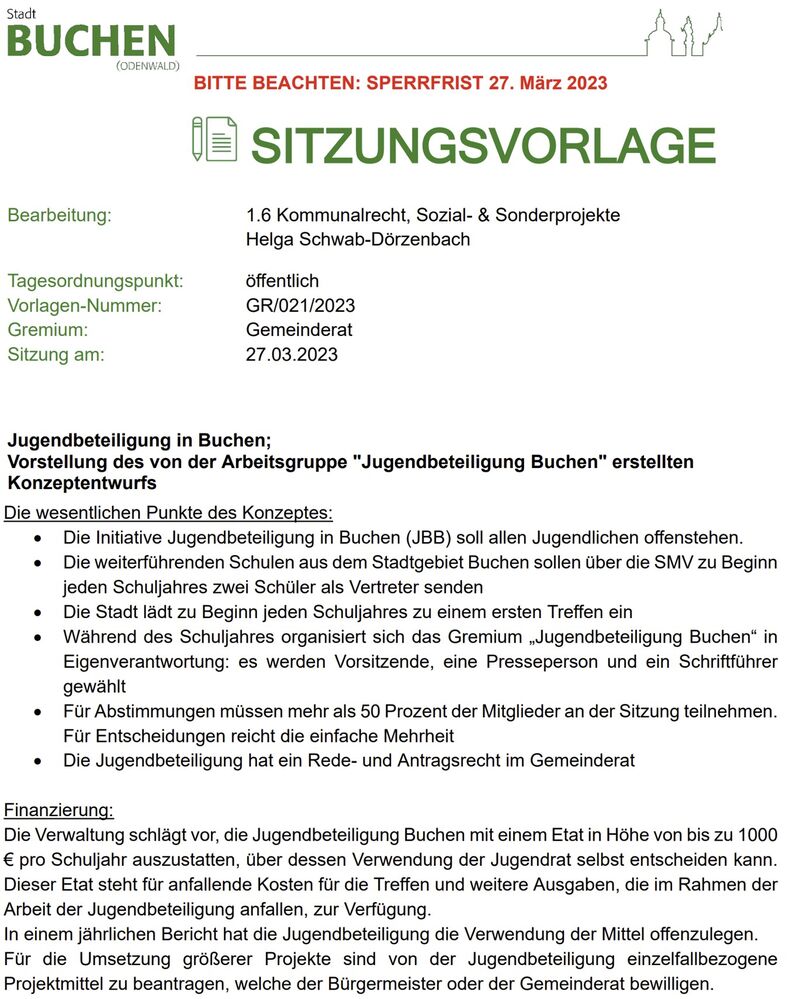 Der Gemeinderat hat dem Konzept der Jugendbeteiligung zugestimmt. Auch die Fraktion SPD/Grün-Links unterstützt dieses Konzept und hat einstimmig zugestimmt.